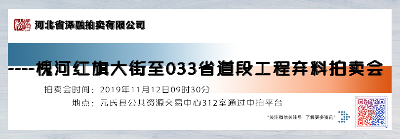 - 拍賣公告 受元氏縣財(cái)政局委托,我公司定于2019年11月12日09時(shí)30分在元氏縣公共資源交易中心312室通過中拍平臺(tái)(https://paimai.caa123.org.cn)對(duì)以下標(biāo)的進(jìn)行公開拍賣,現(xiàn)將有關(guān)事宜公告如下: 一、拍賣標(biāo)的:槐河紅旗大街至033省道段工程棄料(詳見拍賣文件…
